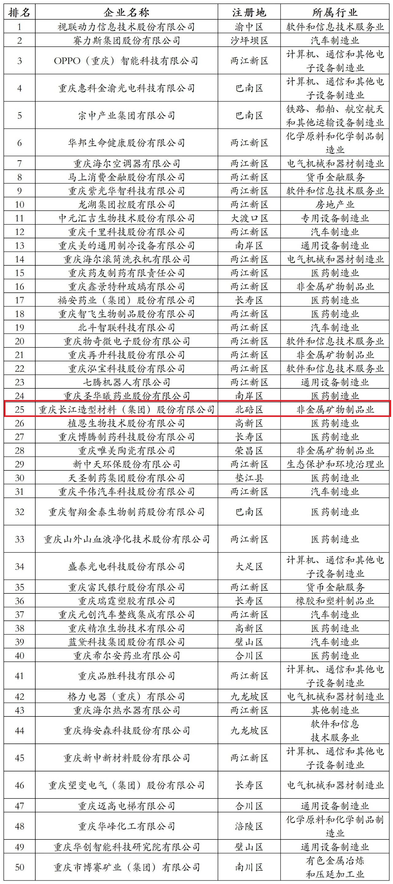 2025重庆民营企业科技创新指数100强榜单
