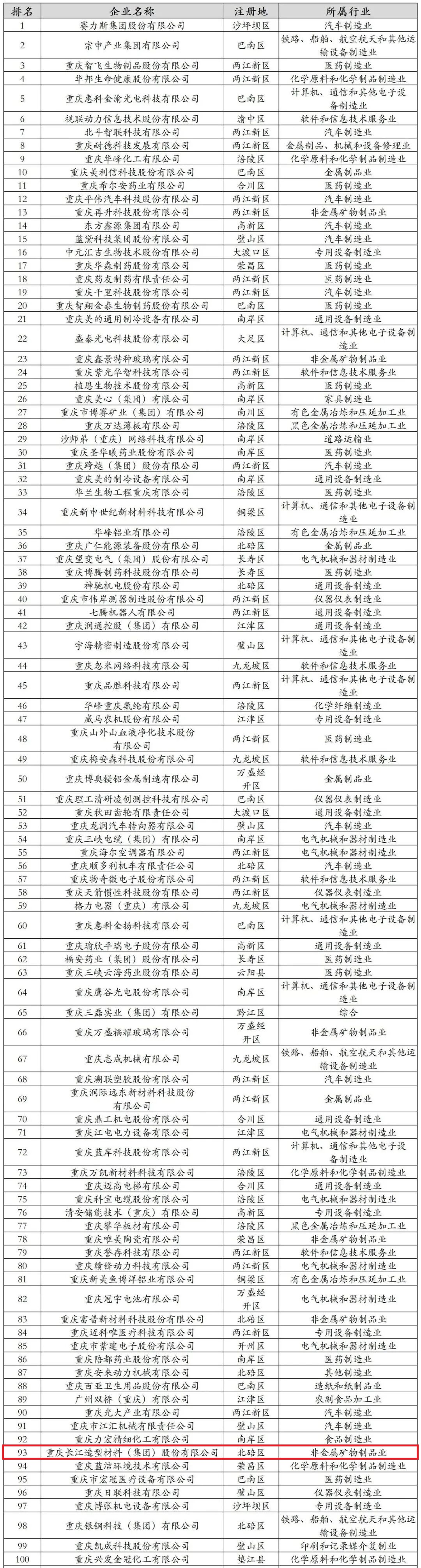 长江材料荣登“重庆民营企业科技创新指数100强”